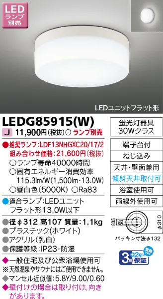 東芝ライテック シーリング LEDシーリング ランプ別売 LEDG85915(W)