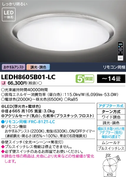 東芝ライテック シーリング LEDシーリングライト LEDH8605B01-LC ~14畳用