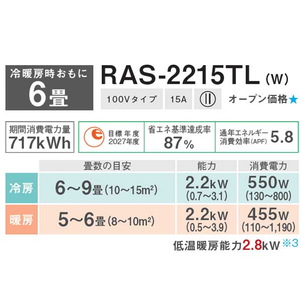 東芝 エアコン おもに6畳用 RAS-2215TL(W) 2025年