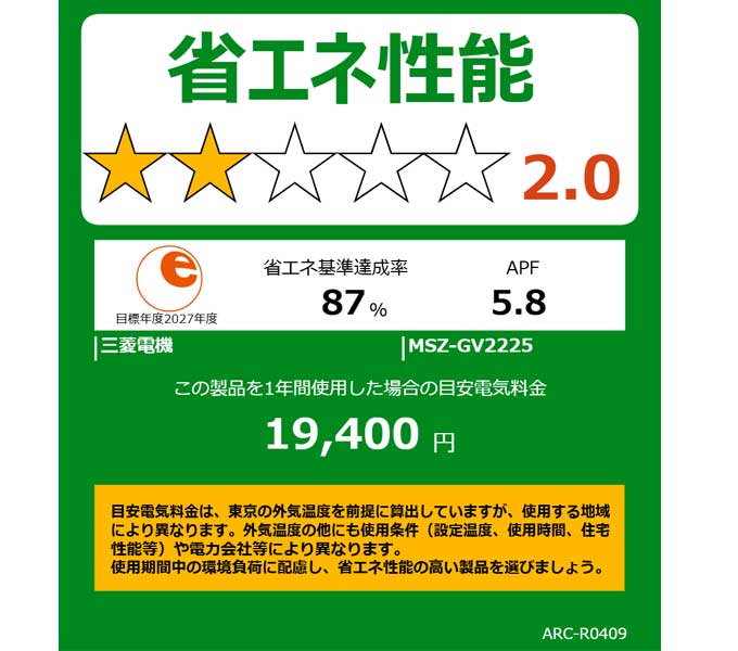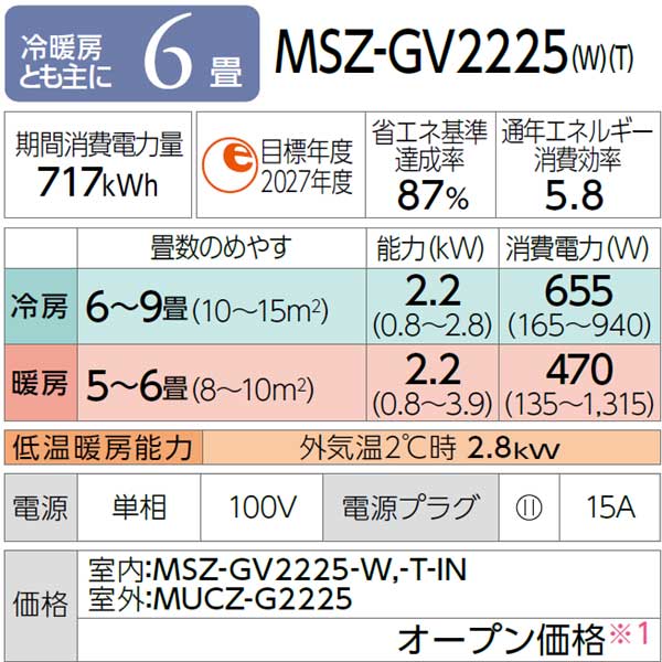 (JIS C 9612:2013)87%/5.8 【冷房】畳数のめやす 6~9畳(10~15m2) 【冷房】能力(kW) 2.2(0.8~2.8) 【冷房】消費電力(W) 655(165~940) 【暖房】畳数のめやす 5~6畳(8~10m2) 【暖房】能力(kW) 2.2(0.8~3.9) 【暖房】消費電力(W) 470(135~1,315) 低温暖房能力 2.8kW外気温2℃時 メーカー保証期間 1年間