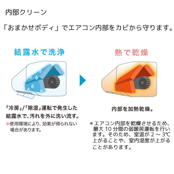 *エアコン内部を乾燥させるため、最大10分間の弱暖房運転を行います。そのため、室温が2~3℃上がることや、室内湿度が上がることがあります(「冷房」/「除湿」運転後。)