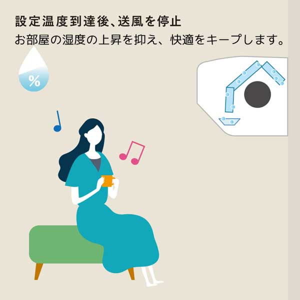 設定温度到達後、送風を停止することでお部屋の湿度の上昇を抑え、快適をキープします。