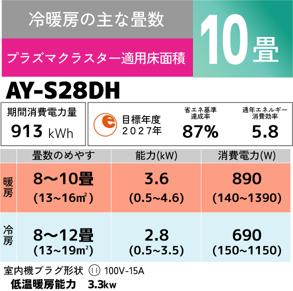 (JIS C 9612:2013)87%/5.8 【暖房】畳数のめやす 8~10畳(13~16m2) 【暖房】能力(kW) 3.6(0.5~4.6) 【暖房】消費電力(W) 890(140~1,390) 【冷房】畳数のめやす 8~12畳(13~19m2) 【冷房】能力(kW) 2.8(0.5~3.5) 【冷房】消費電力(W) 690(150~1150) 低温暖房能力 3.3kW外気温2℃時 メーカー保証期間 1年間