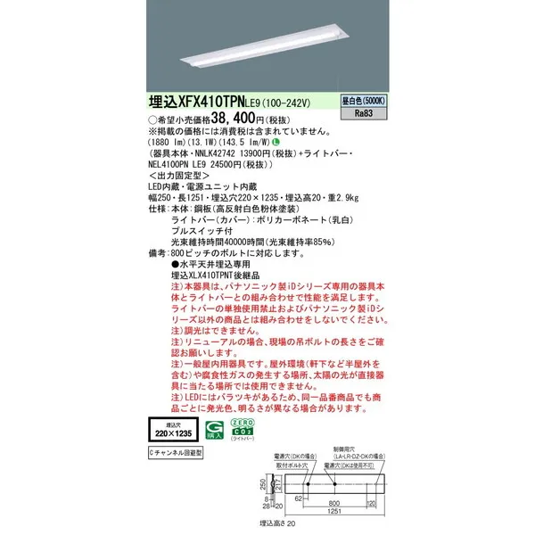 パナソニック 施設照明器具 LEDベースライト 天井埋込型 一体型 XFX410TPNLE9