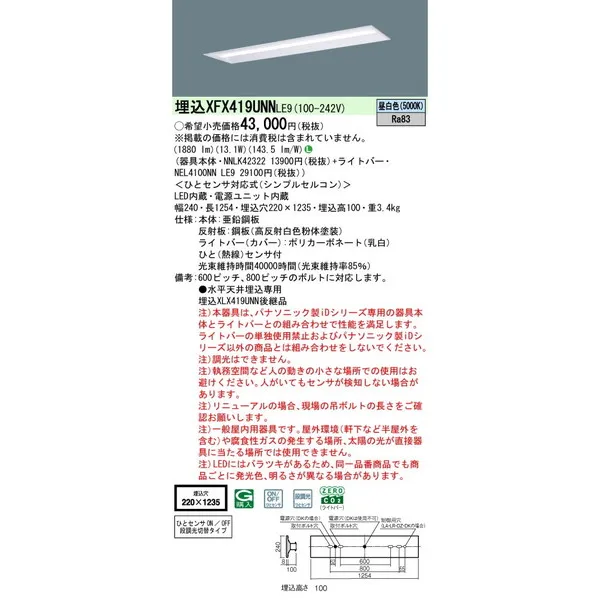 パナソニック 施設照明器具 LEDベースライト 天井埋込型 一体型 XFX419UNNLE9