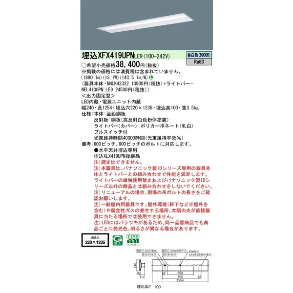 パナソニック 施設照明器具 LEDベースライト 天井埋込型 一体型 XFX419UPNLE9