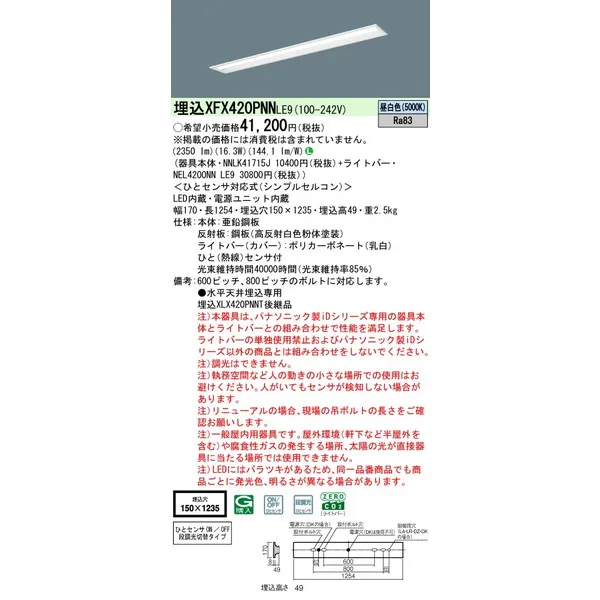 パナソニック 施設照明器具 LEDベースライト 天井埋込型 一体型 XFX420PNNLE9