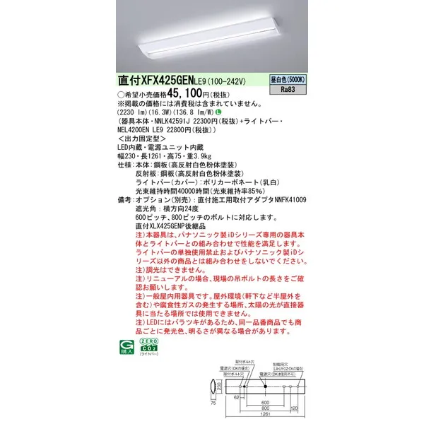 パナソニック 施設照明器具 LEDベースライト 天井埋込型 一体型 XFX425GENLE9