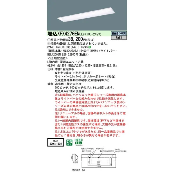 パナソニック 施設照明器具 LEDベースライト 天井埋込型 一体型 XFX427GENLE9