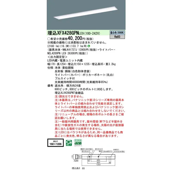 パナソニック 施設照明器具 LEDベースライト 天井埋込型 一体型 XFX428GPNLE9