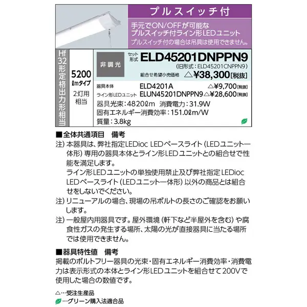 岩崎電気 LEDベースライト 40W形 直付形 昼白色 Hf32形定格出力形相当 プルスイッチ付 ELD45201DNPPN9