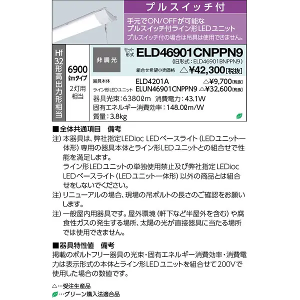 岩崎電気 LEDベースライト 40W形 直付形 昼白色Hf32形高出力形相当 プルスイッチ付 ELD46901CNPPN9