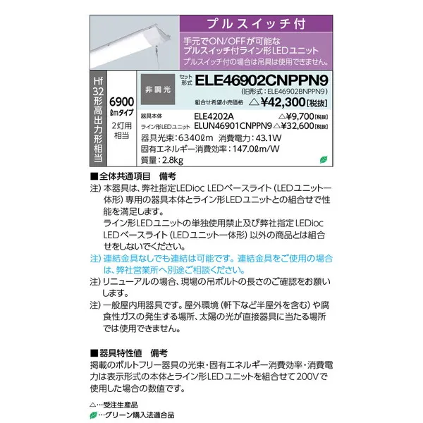 岩崎電気 LEDベースライト 天井埋込型一体型 ELE46902CNPPN9