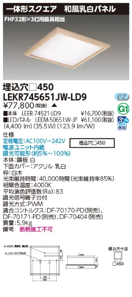 東芝ライテック LEDベースライト ベースライト□450和風乳白W色 LEKR745651JW-LD9