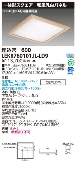 定格電圧 100V~242V 器具幅 □:634 mm 埋め込みサイズ □:600 mm 質量 8.9 kg 調光方式 PWM制御 調光範囲 約5%~100% 光色(相関色温度、平均演色評価数) 電球色(3000K Ra:83) 光束維持時間 40,000時間(光束維持率85%) 器具光束 7300 lm 定格消費電力 62.5W(100V) 60.5W(200V) 60.5W(242V) 入力電流 627mA(100V) 313mA(200V) 265mA(242V) エネルギー消費効率 116.8lm/W(100V) 120.6lm/W(200V) 120.6lm/W(242V) 周波数 50/60Hz 付加機能 調光タイプ 材質 本体鋼板白/下面カバーアクリル乳白 始動電圧 LD9 補助点灯装置 電源ユニット内蔵 調光可能形(約5%~100%) 備考 断熱施工不可