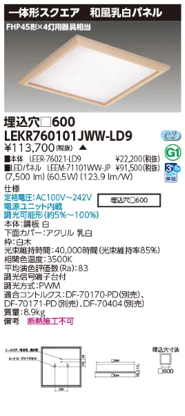 定格電圧 100V~242V 器具幅 □:634 mm 埋め込みサイズ □:600 mm 質量 8.9 kg 調光方式 PWM制御 調光範囲 約5%~100% 光色(相関色温度、平均演色評価数) 温白色(3500K Ra:83) 光束維持時間 40,000時間(光束維持率85%) 器具光束 7500 lm 定格消費電力 62.5W(100V) 60.5W(200V) 60.5W(242V) 入力電流 627mA(100V) 313mA(200V) 265mA(242V) エネルギー消費効率 120lm/W(100V) 123.9lm/W(200V) 123.9lm/W(242V) 周波数 50/60Hz 付加機能 調光タイプ 材質 本体鋼板白/下面カバーアクリル乳白 始動電圧 LD9 補助点灯装置 電源ユニット内蔵 調光可能形(約5%~100%) 備考 断熱施工不可