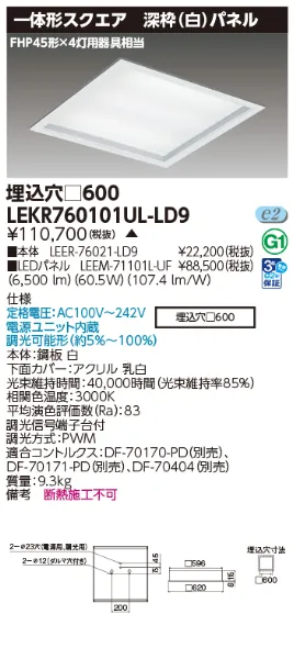 定格電圧 100V~242V 器具幅 □:620 mm 埋め込みサイズ □:600 mm 質量 9.3 kg 調光方式 PWM制御 調光範囲 約5%~100% 光色(相関色温度、平均演色評価数) 電球色(3000K Ra:83) 光束維持時間 40,000時間(光束維持率85%) 器具光束 6500 lm 定格消費電力 62.5W(100V) 60.5W(200V) 60.5W(242V) 入力電流 627mA(100V) 313mA(200V) 265mA(242V) エネルギー消費効率 104lm/W(100V) 107.4lm/W(200V) 107.4lm/W(242V) 周波数 50/60Hz 付加機能 調光タイプ 材質 本体鋼板白/下面カバーアクリル乳白 始動電圧 LD9 補助点灯装置 電源ユニット内蔵 調光可能形(約5%~100%) 備考 断熱施工不可
