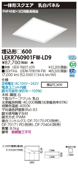 東芝ライテック LEDベースライト 埋込□600乳白 LEKR760901FW-LD9