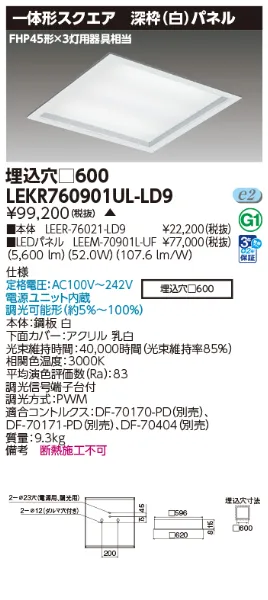 東芝ライテック LEDベースライト □600深枠白L LEKR760901UL-LD9