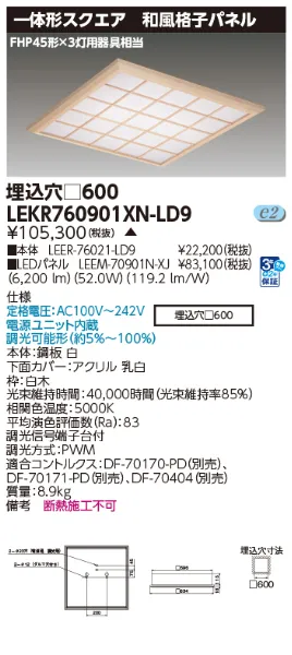 定格電圧 100V~242V 器具幅 □:634 mm 埋め込みサイズ □:600 mm 質量 8.9 kg 調光方式 PWM制御 調光範囲 約5%~100% 光色(相関色温度、平均演色評価数) 昼白色(5000K Ra:83) 光束維持時間 40,000時間(光束維持率85%) 器具光束 6200 lm 定格消費電力 54.0W(100V) 52.0W(200V) 52.0W(242V) 入力電流 542mA(100V) 271mA(200V) 230mA(242V) エネルギー消費効率 114.8lm/W(100V) 119.2lm/W(200V) 119.2lm/W(242V) 周波数 50/60Hz 付加機能 調光タイプ 材質 本体鋼板白/下面カバーアクリル乳白 始動電圧 LD9 補助点灯装置 電源ユニット内蔵 調光可能形(約5%~100%) 備考 断熱施工不可