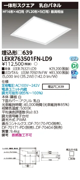 定格電圧 100V~242V 器具幅 □:656 mm 埋め込みサイズ □:639 mm 質量 9.4 kg 調光方式 PWM制御 調光範囲 約5%~100% 光色(相関色温度、平均演色評価数) 昼白色(5000K Ra:83) 光束維持時間 40,000時間(光束維持率85%) 器具光束 5000 lm 定格消費電力 36.2W(100V) 35.2W(200V) 35.2W(242V) 入力電流 365mA(100V) 188mA(200V) 161mA(242V) エネルギー消費効率 138.1lm/W(100V) 142lm/W(200V) 142lm/W(242V) 周波数 50/60Hz 付加機能 調光タイプ 材質 本体鋼板白/下面カバーアクリル乳白 始動電圧 LD9 補助点灯装置 電源ユニット内蔵 調光可能形(約5%~100%) 備考 断熱施工不可