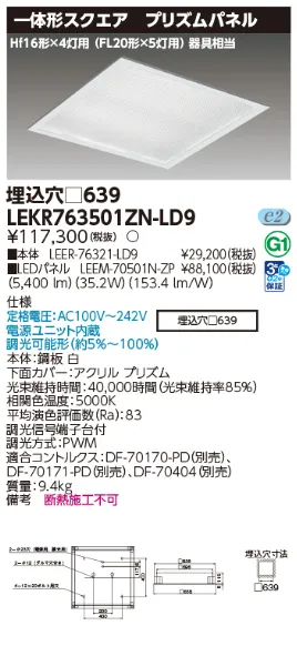 東芝ライテック LEDベースライト 639プリズムN LEKR763501ZN-LD9