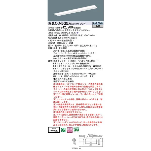 パナソニック 施設照明器具 LEDベースライト 天井埋込型 一体型 XFX430RLNRZ9