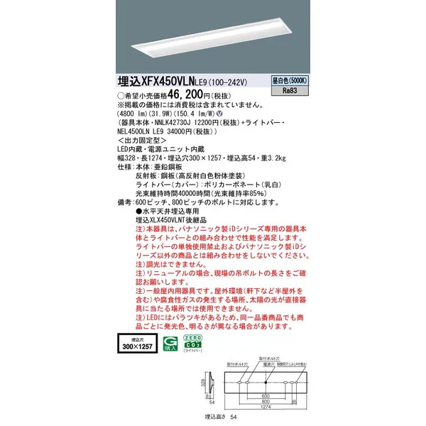 パナソニック 施設照明器具 LEDベースライト 天井埋込型 一体型 XFX450VLNLE9