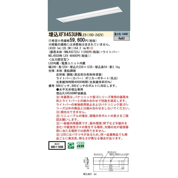 パナソニック 施設照明器具 LEDベースライト 天井埋込型 一体型 XFX453UHNLE9