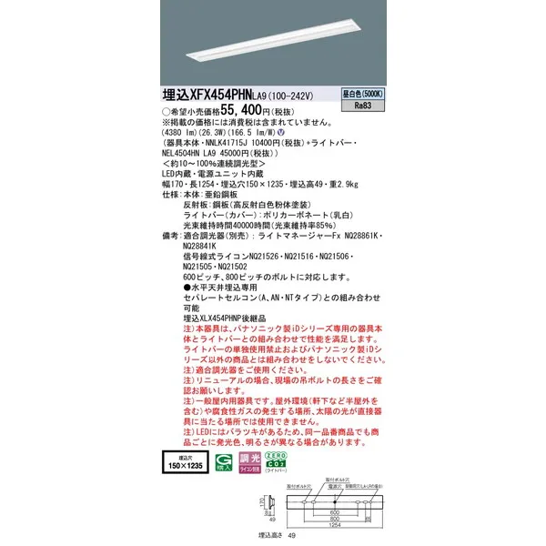 パナソニック 施設照明器具 LEDベースライト 天井埋込型 一体型 XFX454PHNLA9