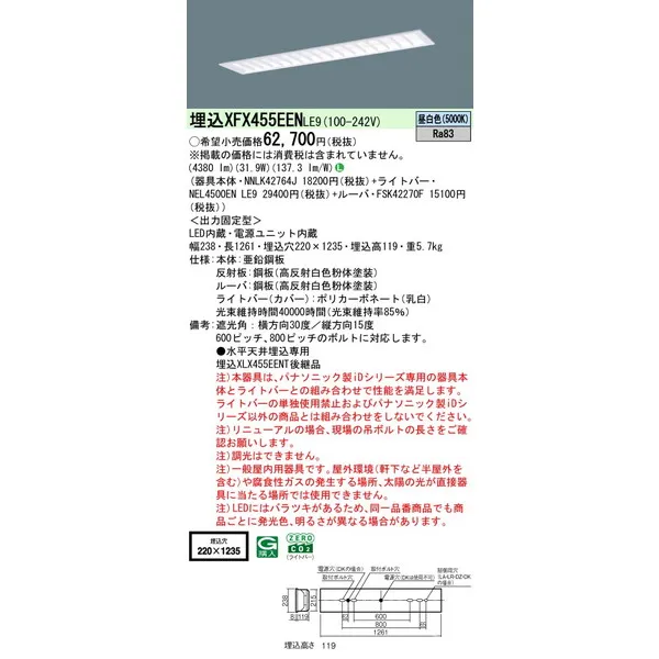 パナソニック 施設照明器具 LEDベースライト 天井埋込型 一体型 XFX455EENLE9
