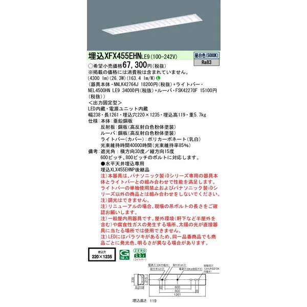 パナソニック 施設照明器具 LEDベースライト 天井埋込型 一体型 XFX455EHNLE9