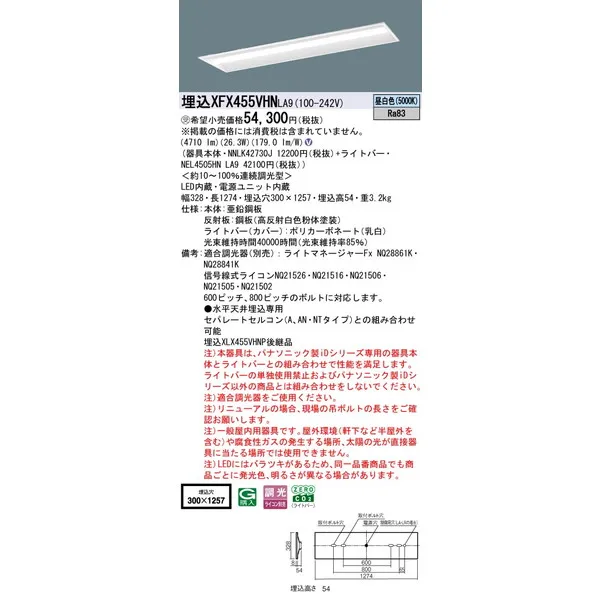 パナソニック 施設照明器具 LEDベースライト 天井埋込型 一体型 XFX455VHNLA9
