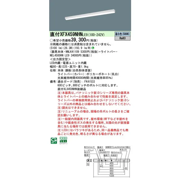 パナソニック LEDベースライト 天井直付型 一体型 XFX459NHNLE9 iスタイル ストレートタイプ 笠なし型