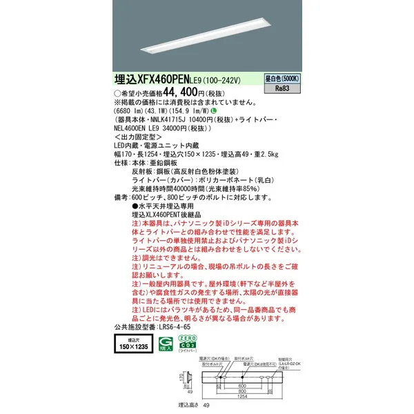 パナソニック 施設照明器具 LEDベースライト 天井埋込型 一体型 XFX460PENLE9