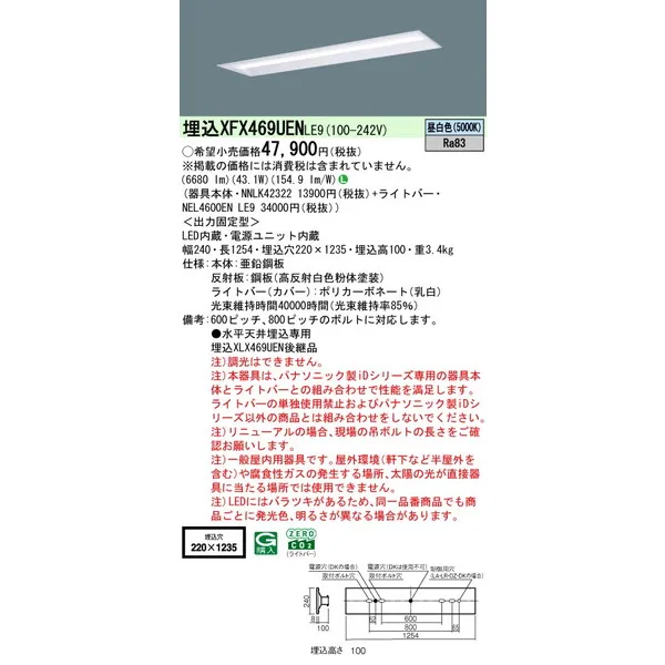 パナソニック 施設照明器具 LEDベースライト 天井埋込型 一体型 XFX469UENLE9