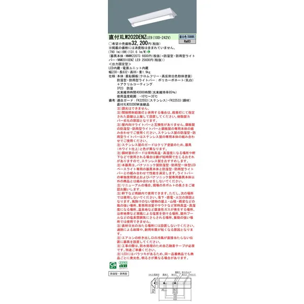 パナソニック LEDベースライト 天井直付型 一体型 XLW202DENZLE9 防湿型・防雨型