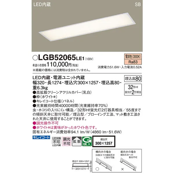 パナソニック 施設照明器具 LEDベースライト 天井直付型 一体型 LGB52065LE1