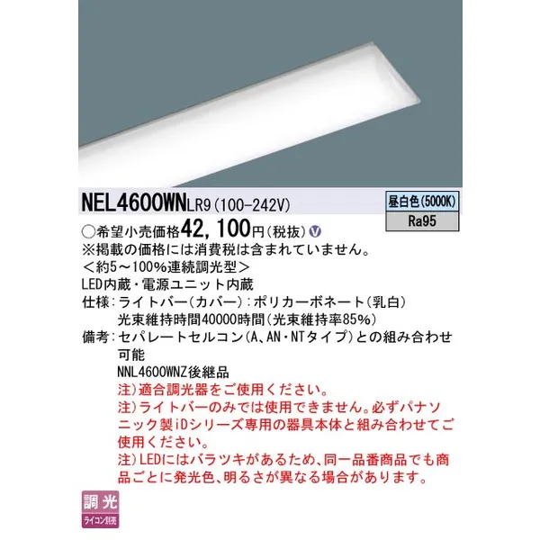 パナソニック 施設照明器具 LEDベースライト ライトバー NEL4600WNLR9