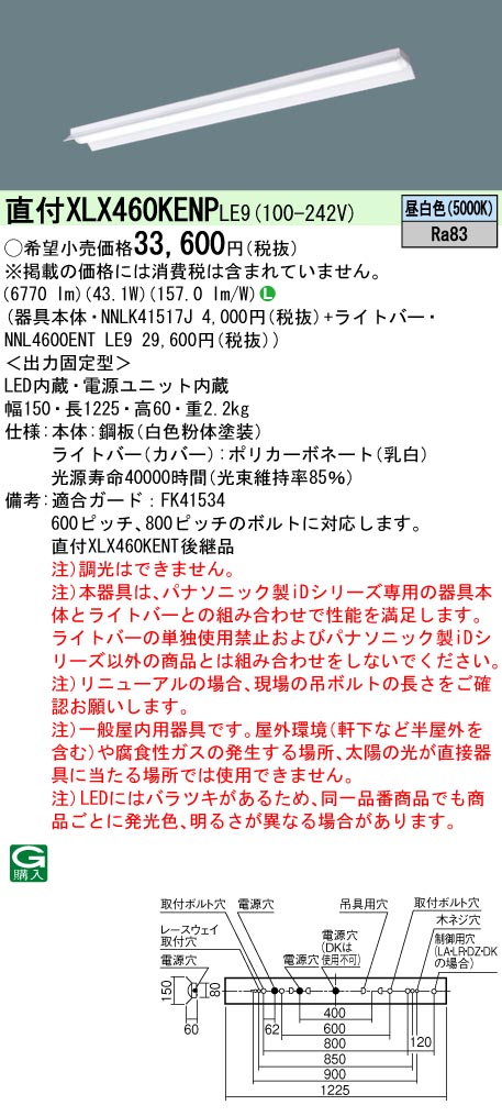 ◆質量:2.2 kg器具光束 6770 lm lm 安定器出力型 定格出力型 [安定器補足:<出力固定型>] 電圧 100~242 V 消費電力 43.1 W 消費効率 157 lm/W 適合ガード FK41534
