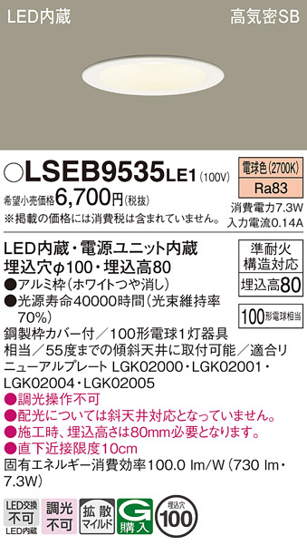 パナソニック ダウンライト 100形拡散タイプ LSEB9535LE1
