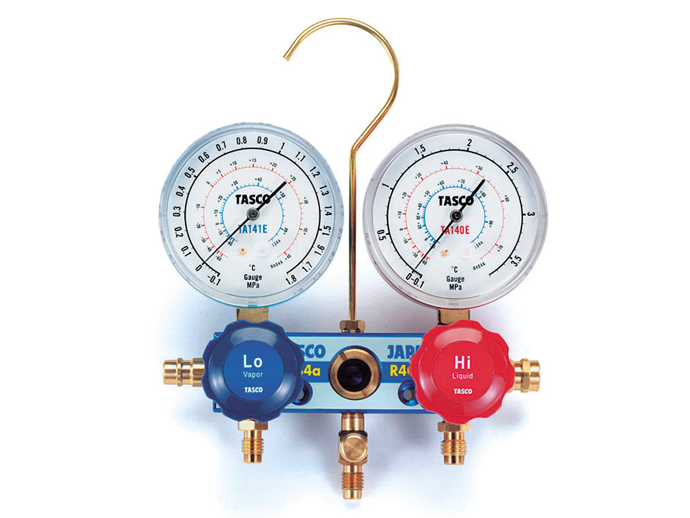 - □ R134aR404A冷凍冷蔵ユニット専用カーエアコンのゲージマニホールドですから、数値が読みとりやすく使いやすいゲージマニホールドです。