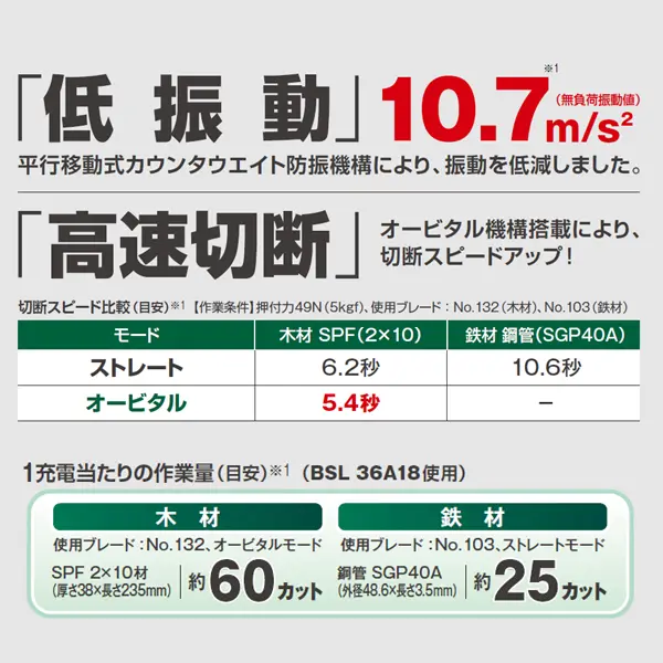 【軟鋼材】厚さ 19mm無負荷ストローク数 0?3,000min-1(回/分) ストローク量 29mm 機体寸法(全長×全高×全幅) 458×211×95mm(蓄電池装着時) 質量 3.7kg(蓄電池装着時)