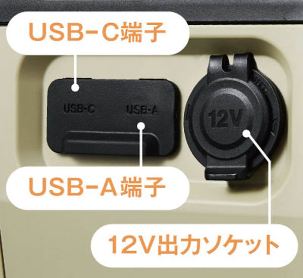 新たに12V出力※ソケット/USB-C端子を装備しました。12V車載用機器やスマートフォン等の充電などに使用可能です。(車載用機器、USBコードは市販品をご使用ください。)