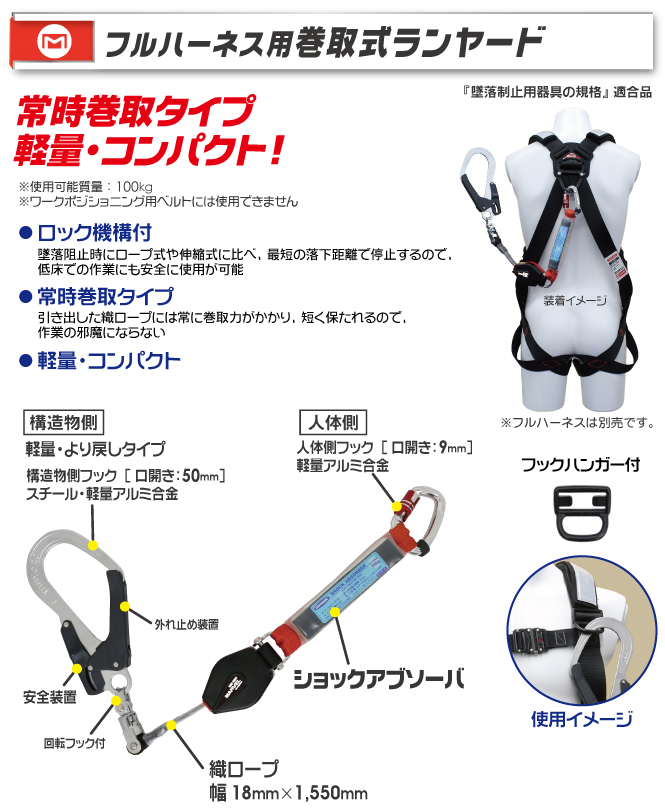 墜落阻止時にロープ式や伸縮式に比べ、最短の落下