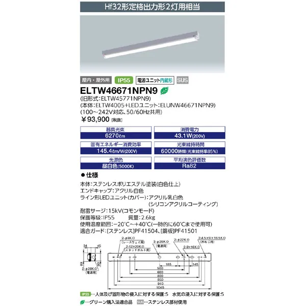 岩崎電気 LEDベースライト レディオック マルチライン オイルミスト対応形 1000mmタイプ (ステンレス) 昼白色 ELTW46671NPN9