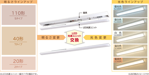 ●フロアのレイアウト変更で明るくしたい時、光色を変えたい時、省エネを重視したい時など、LED光源ユニットを交換することでさまざまな用途に対応します。