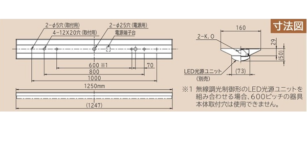 品番 NC4A1 タイプ 直付形・逆富士形 寸法(幅W×長さL×高さH)(mm) W160×L1250×D50 質量 2.4kg 無線調光制御形と連続調光・固定出力兼用形の連続調光の範囲 (調光)100~約20% 材質(本体) 鋼板(白色) 周囲温度 5℃~35℃でご使用下さい。 グリーン購入法 適合