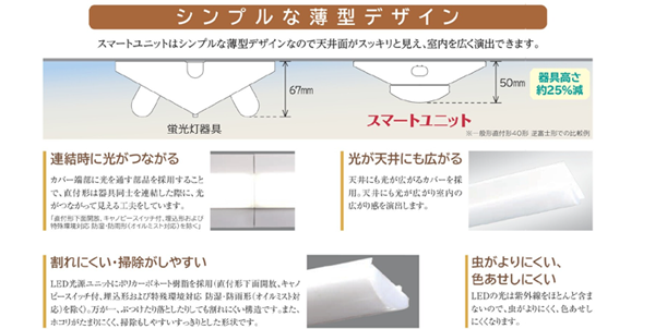 ●既設の蛍光灯器具に配慮したサイズで、外したあとに天井の補修工事なしでそのまま設置できます。
