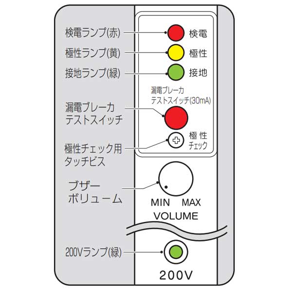 (ブザーで通電チェック、ランプで電圧、極性、アースチェック、漏電ブレーカチェック)
